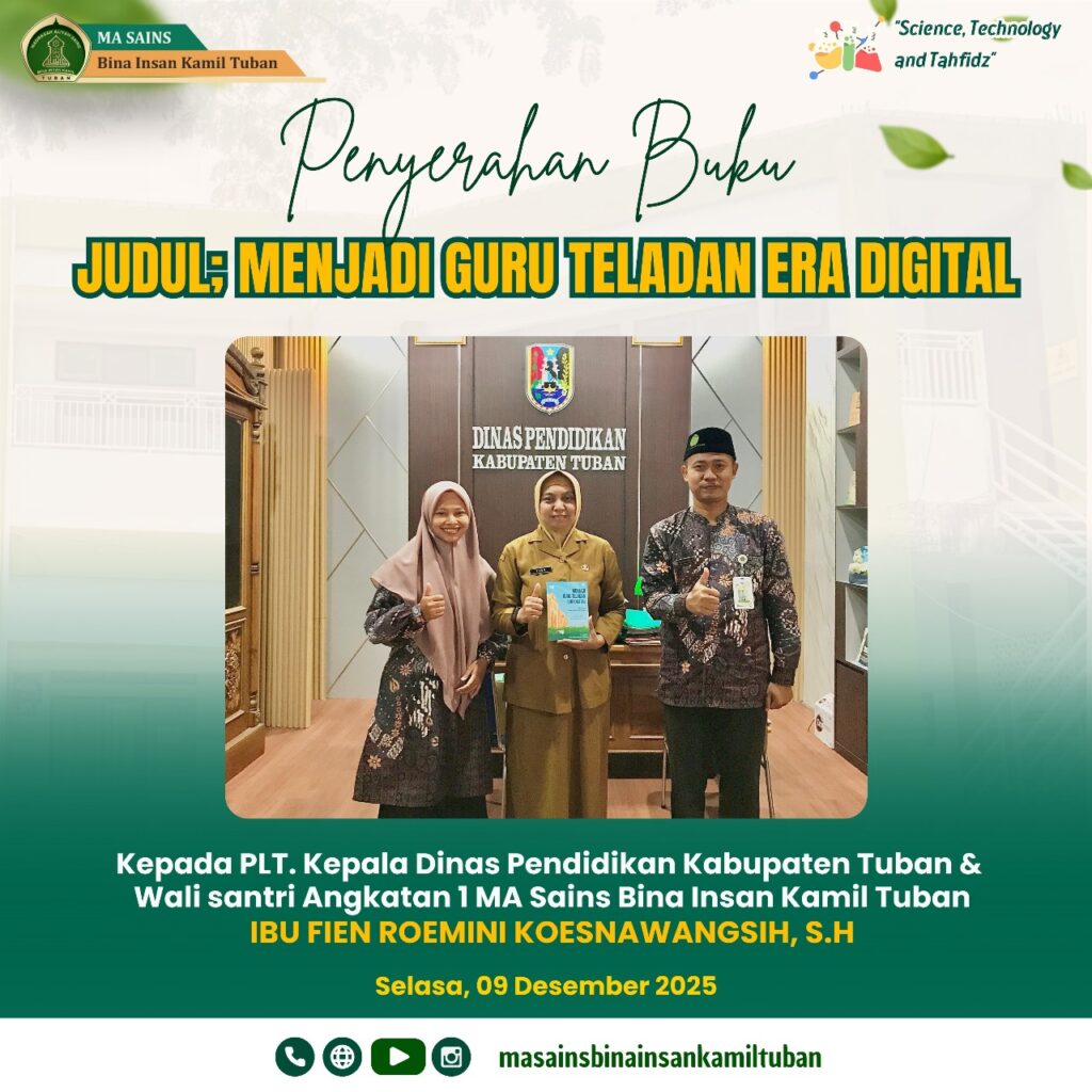 Tuban (Humas MA Sains BIK) — Buku karya literasi santri MA Sains Bina Insan Kamil Tuban yang berjudul Menjadi Guru Teladan Era Digital diserahkan kepada PLT. Kepala Dinas Pendidikan Kabupaten Tuban.